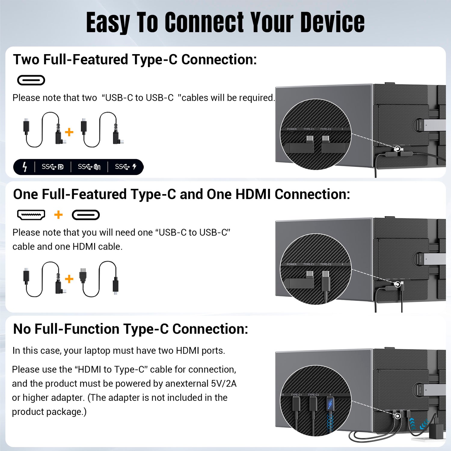 (Please note: When using the HDMI cable, connect an additional USB-A to USB-C cable on the same screen extender for power supply)